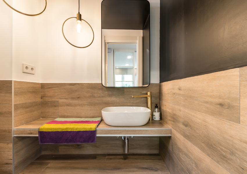 Los revestimientos cerámicos en tonos madera y piedra crean una atmósfera cálida y uniforme, mientras que las duchas con mamparas de vidrio, griferías empotradas y sanitarios suspendidos completan un diseño limpio y funcional. En uno de los aseos, un lavabo sobre bancada con grifería dorada y una iluminación cálida crean un ambiente más expresivo y moderno, sin perder sobriedad.