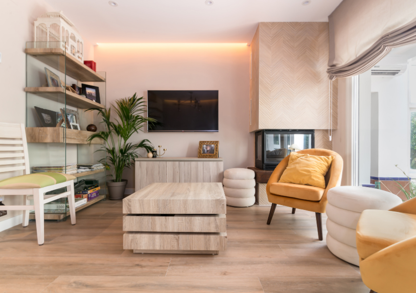 Se optó por un pavimento porcelánico continuo con acabado efecto madera, elegido por su resistencia, facilidad de mantenimiento y estética cálida. Este material aporta unidad visual en toda la vivienda y refuerza la sensación de hogar.