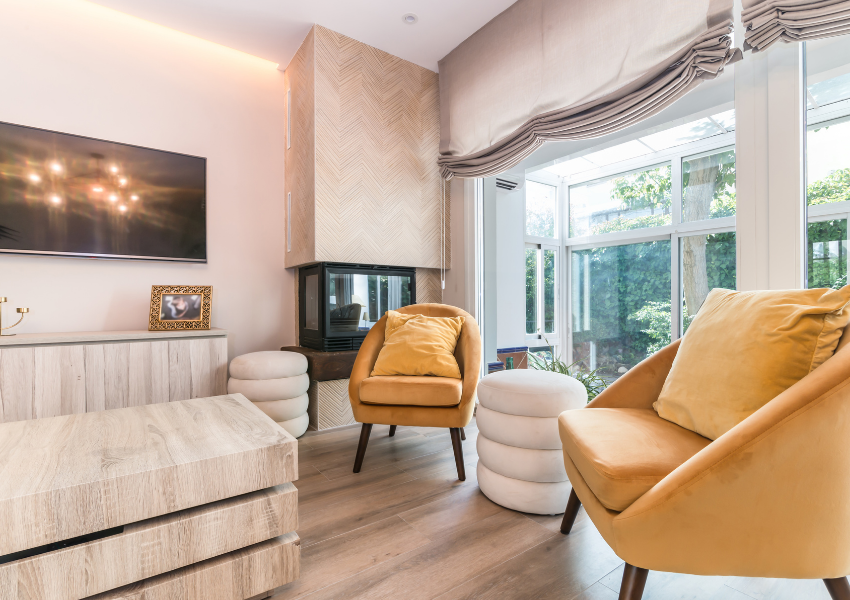 En el salón se diseñó un frente de chimenea decorativa, revestido con piezas cerámicas colocadas en espiga. Este elemento, además de aportar carácter, se convierte en un punto focal que equilibra el conjunto del espacio de estar.