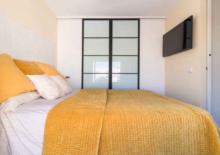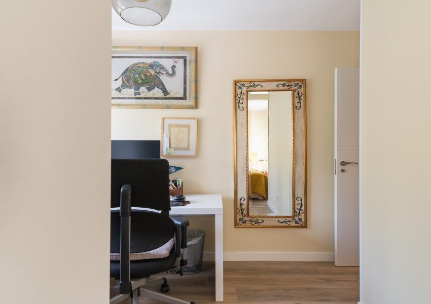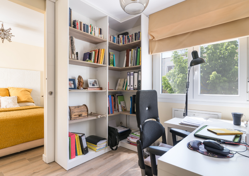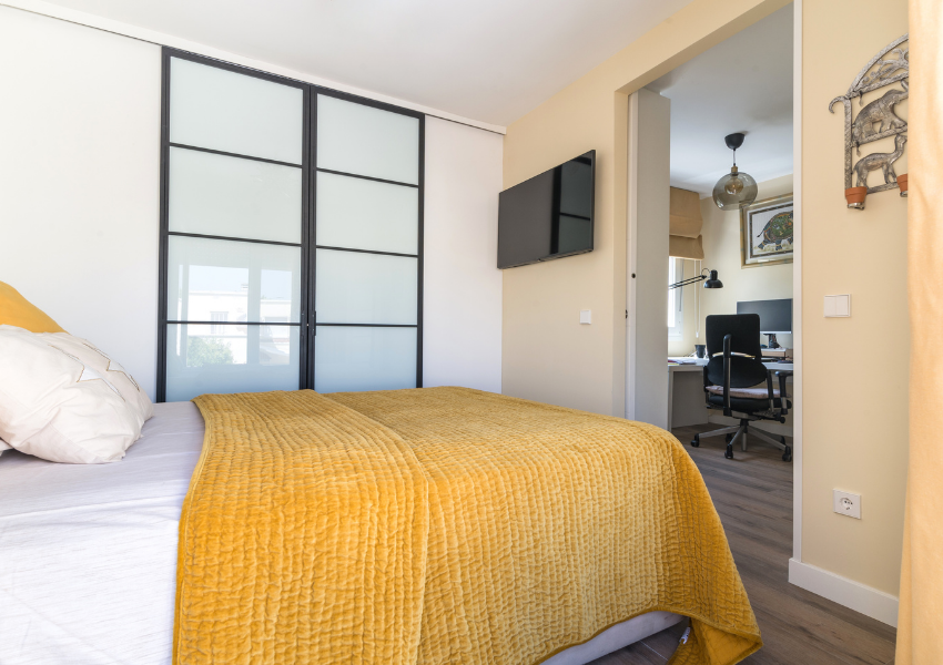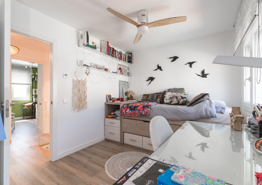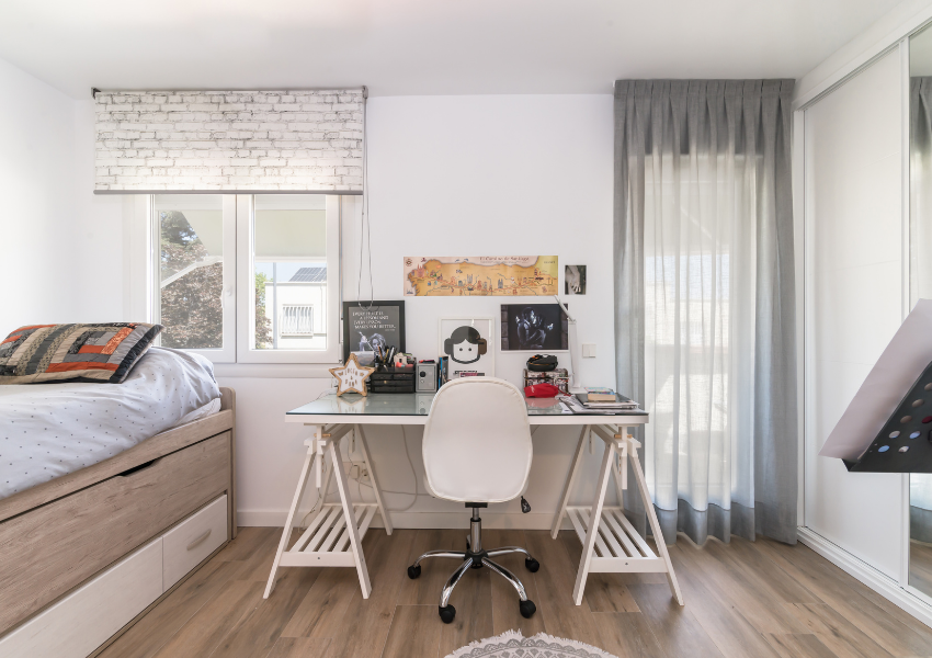 Los dormitorios se diseñaron con soluciones a medida, armarios empotrados con frentes correderos de vidrio opal y muebles adaptados al uso real de cada estancia. En los cuartos juveniles se integraron zonas de estudio con iluminación natural, mobiliario funcional y paletas neutras, que permiten personalizar el entorno manteniendo el orden visual.