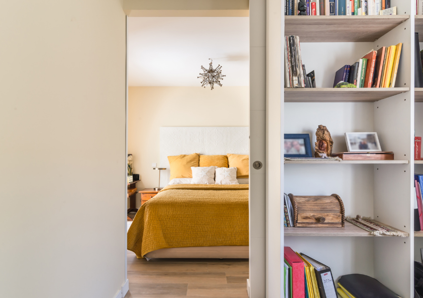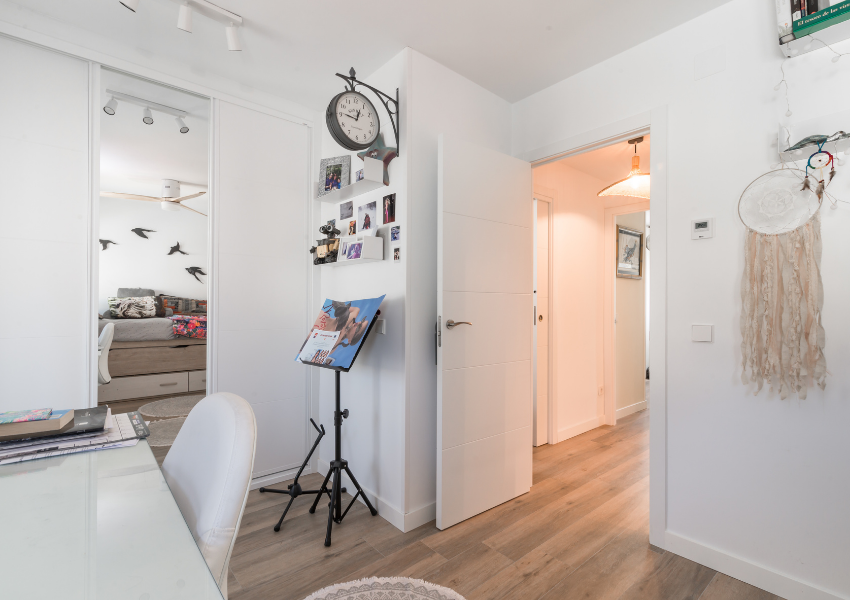Se incorporaron puertas correderas embutidas en estancias como el despacho, el dormitorio principal o los accesos a zonas privadas. Este tipo de soluciones permite ganar espacio útil, evitar interferencias con el mobiliario y mejorar la sensación de amplitud, sin renunciar al confort acústico ni a la privacidad.