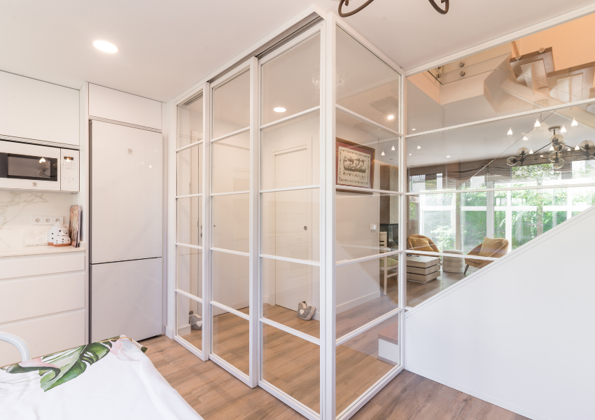La cocina se diseñó como un espacio funcional y estético, conectado con la entrada y el comedor. Se instaló un separador de ambientes de vidrio con perfilería lacada blanca, que define el espacio sin cerrarlo, permitiendo el paso de luz y reforzando la continuidad visual.